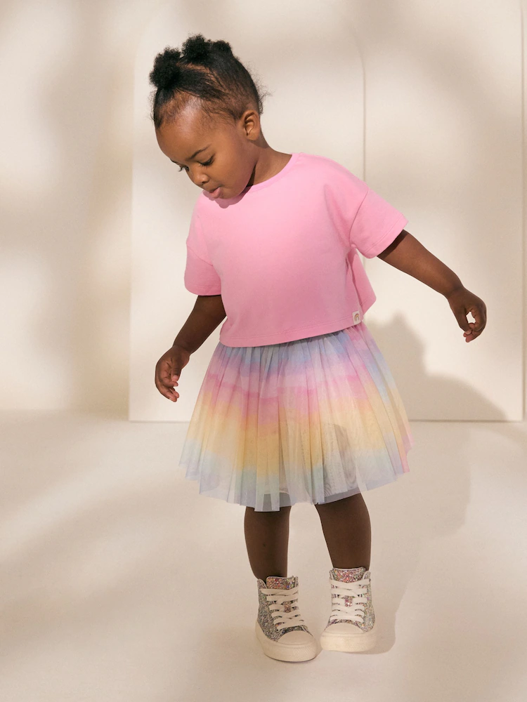 This vibrant 2-piece set features a boxy pure-cotton T-Shirt, featuring a crewneck collar and short sleeves in a bright pink hue, alongside a rainbow tutu skirt with an elasticated waistband, a mesh fabric outer and a comfortable cotton-blend lining.